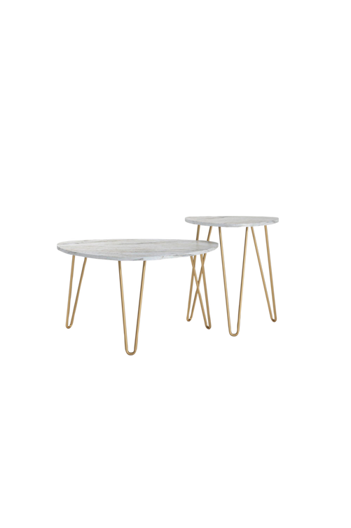 Uppgradera vardagsrummet med borden Athena Nesting Tables från Novogratz. De är tillverkade av PVC-laminerad spånskiva med en marmorliknande finish samt har guldfärgade metallben som skapar en glamourös retrokänsla. Tack vare PVC-lamineringen torkar du enkelt bort spill med en fuktig trasa. Bordsskivornas unika form drar blickarna till sig och de är rymliga nog för att snacks, fjärrkontroller och elektronik ska få plats. Använd borden var för sig som soffbord respektive sidobord, eller ställ dem bredvid varandra och skapa ett unikt bord i två nivåer. Borden levereras i ett platt paket och kräver minimal montering. Det är bara att sätta på benen.