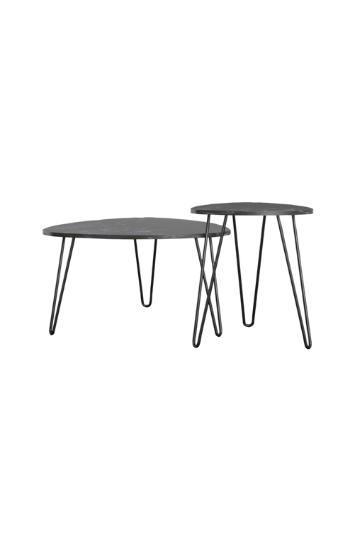 Uppgradera vardagsrummet med borden Athena Nesting Tables från Novogratz. De är tillverkade av PVC-laminerad spånskiva med en marmorliknande finish samt har guldfärgade metallben som skapar en glamourös retrokänsla. Tack vare PVC-lamineringen torkar du enkelt bort spill med en fuktig trasa. Bordsskivornas unika form drar blickarna till sig och de är rymliga nog för att snacks, fjärrkontroller och elektronik ska få plats. Använd borden var för sig som soffbord respektive sidobord, eller ställ dem bredvid varandra och skapa ett unikt bord i två nivåer. Borden levereras i ett platt paket och kräver minimal montering. Det är bara att sätta på benen.