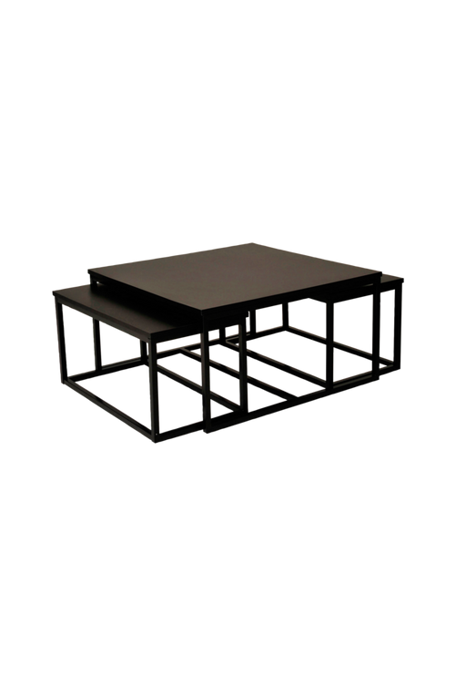 Stilrent soffbord set med topp i melamin på MDF. Lackade metallben. Mått; 1 st 1 st 80×80, höjd 42 cm. 2 st 38×73, höjd 37 cm.