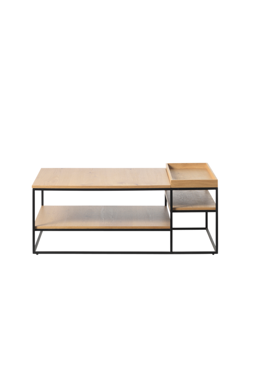 En fyrkantig, luftig, svart metallstomme står i kontrast till mörk, rökig ekfaner eller ekfaner i naturfärg som framhävs av en lätt borstning och inbyggda handtag. Kollektionen RIVOLI, i industristil med en minimalistisk, modern silhuett, passar in i varje kök, kontor, vardagsrum eller matsal.