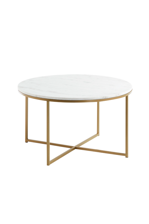 Soffbord med bordsskiva av marmor och stomme av guldfärgad metall. Höjd: 71 cm. Bredd: 80 cm. Djup: 80 cm. Höjd: 46 cm.