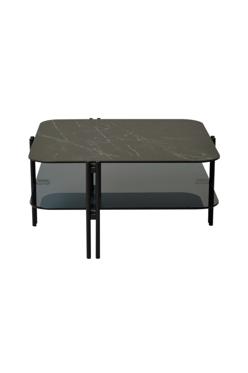 Fint soffbord i svart keramik och härdat rökfärgat glas. Lackerade metallben. Bredd 80 cm, djup 80 cm och höjd 42 cm. Omonterad.