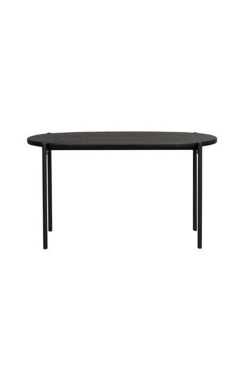 Skye ovalt soffbord i modern, stilren design med bordsskiva i borstad svartmålad ek faner och ben i pulverlackerad metall. Ställs som sidobord, litet soffbord eller som satsbord tillsammans med Skye soffbord 120 cm. Skye finns även som matbord.