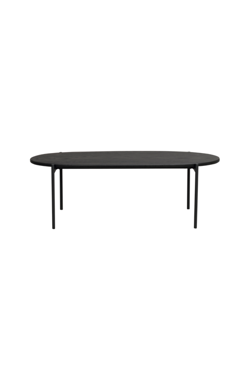 Skye soffbord i minimalistisk stil. Här syns det ovala soffbordet med bordsskiva i borstad svartmålad ek faner och ben i pulverlackerad metall. Skye har även ett mindre ovalt soffbord som går att ha över/tillsammans med detta. I serien ingår också ett runt soffbord samt ett matbord.
