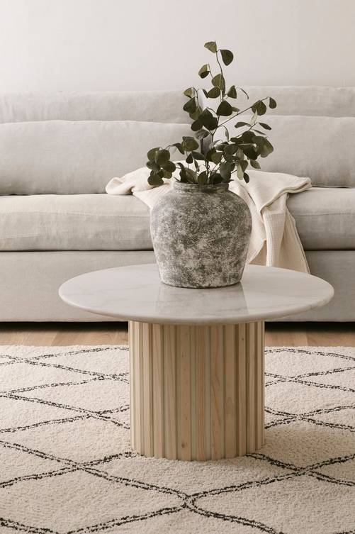 Soffbord med skiva av marmor och underrede av furu med lackad MDF. Levereras i två delar. Enklare montering. Höjd 48 cm. Ø 80 cm. Bordsskivan är tillverkad av naturmaterialet marmor, vilket gör att det är normalt att små avvikelser i storlek, färg och struktur förekommer. Underhåll av marmor: För att ge stenen sitt grundskydd rekommenderas marmorpolish som du hittar i välsorterade färgbutiker. Stryk på ett tunt lager. Låt torka i några minuter. Polera upp till glans med en torr trasa. Detta bör upprepas 1 gång per år. Då marmor är en porös stensort måste man vara extra försiktig med ämnen som kan färga av sig, till exempel syror, stekfett, kaffe, bärsaft med mera.