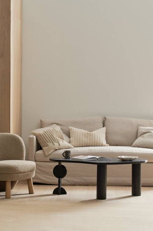 Soffbord i mangoträ med oregelbunden, organisk form. Toppskivan har en vaxad yta med tydlig trästruktur. Två cylinderformade kraftiga ben samt ett mindre ben med skulpterade designdetaljer.