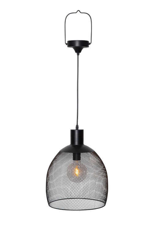 Solcellsdriven lampa i svart metall för utomhusbruk. Passar fint att hänga upp i en pergola, ute i trädgården eller på balkongen. Lampan sprider ett varmvitt sken och lyser i ca 4 h efter laddning. Svart anslutningskabel, sladdlängd 3 m. Drivs med 1 st uppladdningsbart AA-batteri. Batterier medföljer. Material: Metall. Storlek: Höjd 35 cm, bredd 29 cm, djup 29 cm. Sockel/lampa: LED. Lamporna är inte utbytbara.