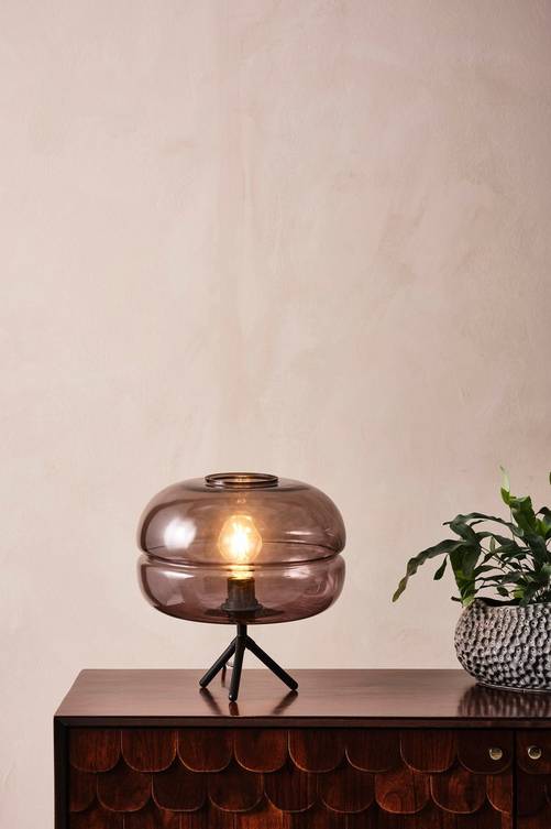 Bordslampa med snyggt formad fot och skärm av rökfärgat glas. En stilren bordslampa som är en perfekt inredningsdetalj som förnyar ditt hem på ett snabbt och enkelt sätt. Svart sladd, sladdlängd 1,5 m. Material: Glas. Storlek: Total höjd 30 cm, ø 29 cm. Sockel/lampa: 1 st E27 max 40 w glödlampa. Ljuskälla medföljer ej.