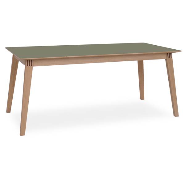 Matbord, utan iläggsskiva. 6 personer. 8-10 personer. – 442 Olive linoleum, kant i vitpigmenterad mattlackad ek och ben massiv vitpigmenterad mattlackerad ek