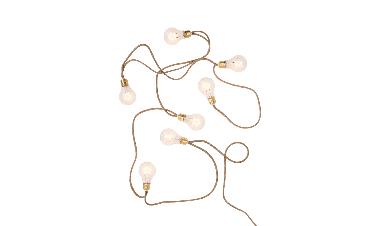Star är en charmig ljusslinga med sladd i naturnära färg och detaljer i guld. Inuti de sju ljuskällorna finns en stjärna som lyser upp och sprider ett varmt ljus.Design & egenskaperMysig ljusslinga med stjärnformade ljuskällor.Tillverkad i jute och PVC.Sladd 6 m med sju ljuskällor placerade på 3 m.Max 3,6W. Ljuskällor ingår.