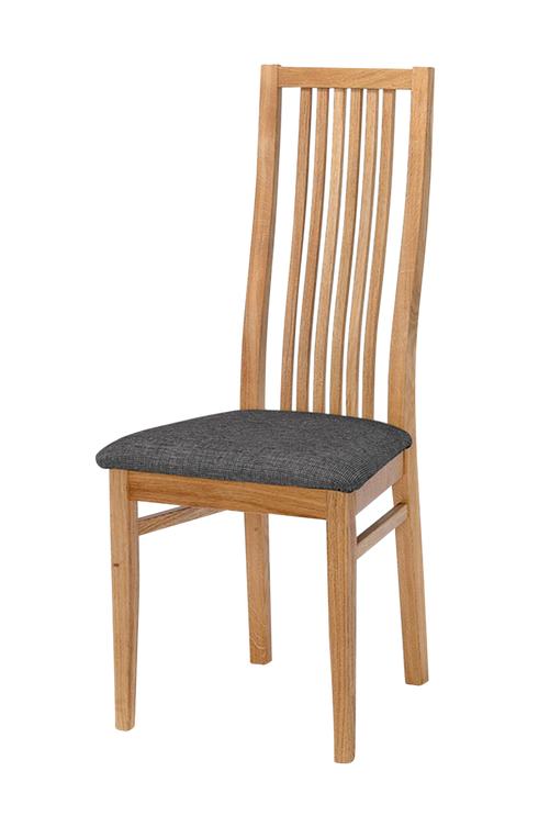 Stol i massiv ek med sits i grått tyg. Bredd 44 cm. djup 53 cm. höjd 103 cm. sitthöjd 45 cm. Vikt 4 kg.