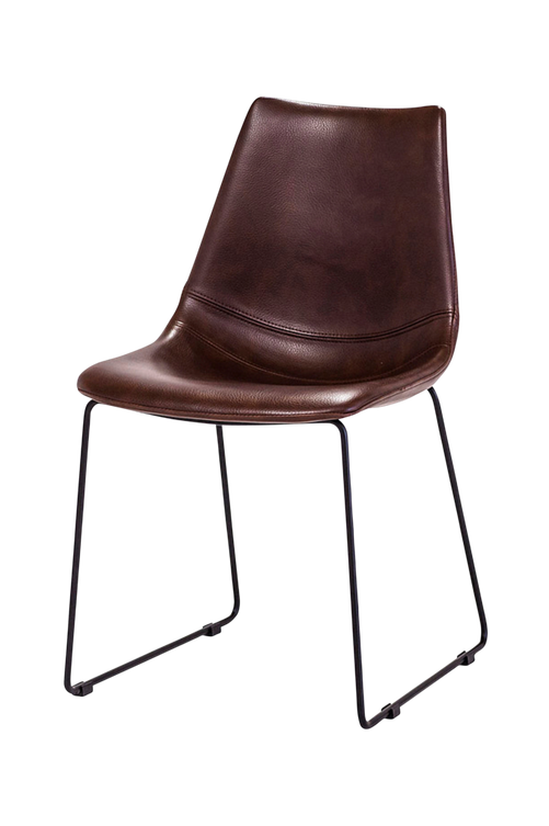 Stol i brun PU med svart metallunderrede. Bredd 47 cm. djup 58 cm. höjd 83 cm. sitthöjd 46 cm. Vikt 7 kg.