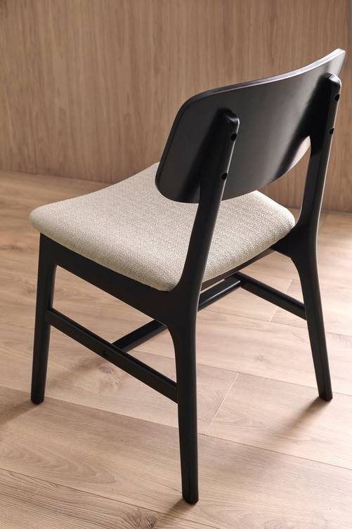 Två stolar i gedigen, stilren och klassisk design med hög kvalitet. Ben och stomme i massivt gummiträ. Sits och ryggbricka av plywood. Ryggbrickan är fanerad och sitsen klädd i textil av polypropylen. Mått: Bredd 47 cm, höjd 80 cm, djup 54 cm. Sittdjup 41 cm, sitthöjd 46 cm. Levereras omonterade.