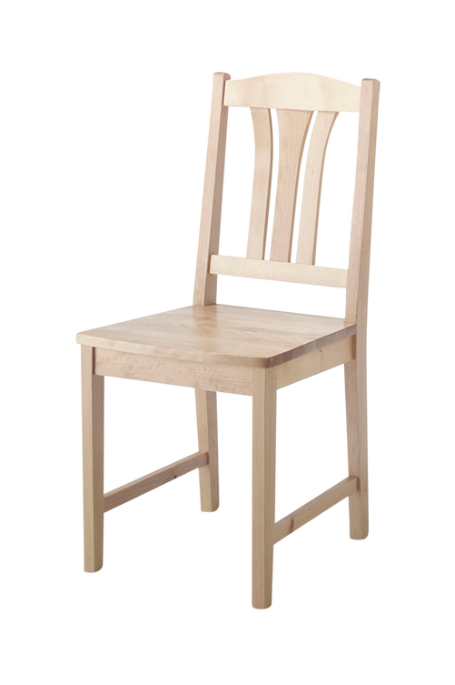 Stol i massiv björk med träsits. Bredd 43 cm. Djup 50 cm. Höjd 93 cm. Sitthöjd 46 cm. Vikt 3 kg.