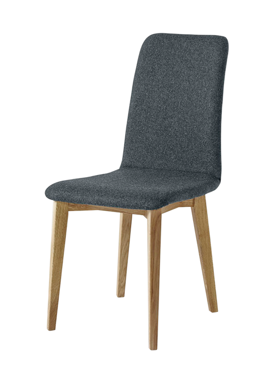 Stol helklädd i tyg Nojus ulltyg mörkgrå, ben i massiv oljad ek. Bredd 43 cm. Djup 56 cm. Höjd 92 cm. Sitthöjd 45 cm. Vikt 3 kg.