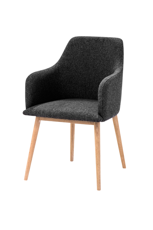 Stol helklädd i tyg Lina ljusgrå med vitoljade ekben. Bredd 52 cm. Djup 57 cm. Höjd 86 cm. Sitthöjd 46 cm. Karmhöjd 68 cm. Vikt 8 kg.