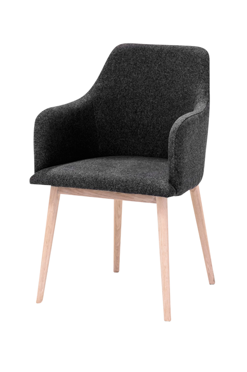 Stol helklädd i tyg Lina ljusgrå med vitoljade ekben. Bredd 52 cm. Djup 57 cm. Höjd 86 cm. Sitthöjd 46 cm. Karmhöjd 68 cm. Vikt 8 kg.