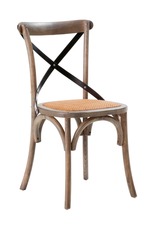 Trästol med rottingsits och metalldetaljer. Höjd 88, djup 52, bredd 50 cm. Sitthöjd 47, sitt djup 42 cm. Monterad.
