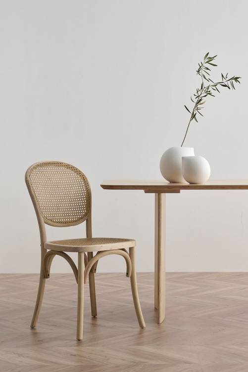 Två stolar av björk med rygg och förstärkt sits av rotting. Höjd 89 cm, bredd 44,5 cm, djup 56 cm. Sittdjup 42 cm, Sitthöjd 46,5 cm. Monterade. Vikt 10 kg.