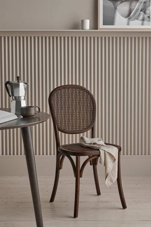 Två stolar av björk med rygg och förstärkt sits av rotting. Höjd 89 cm, bredd 44,5 cm, djup 56 cm. Sittdjup 42 cm, Sitthöjd 46,5 cm. Monterade. Vikt 10 kg.