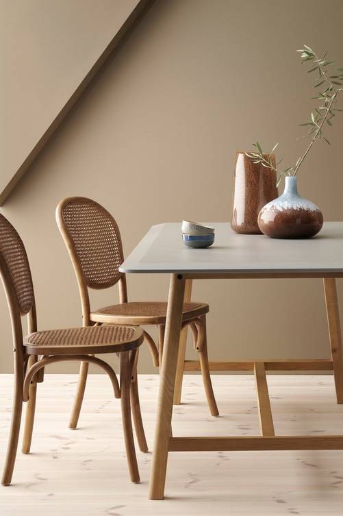 Två stolar av björk med rygg och förstärkt sits av rotting. Höjd 89 cm, bredd 44,5 cm, djup 56 cm. Sittdjup 42 cm, Sitthöjd 46,5 cm. Monterade. Vikt 10 kg.