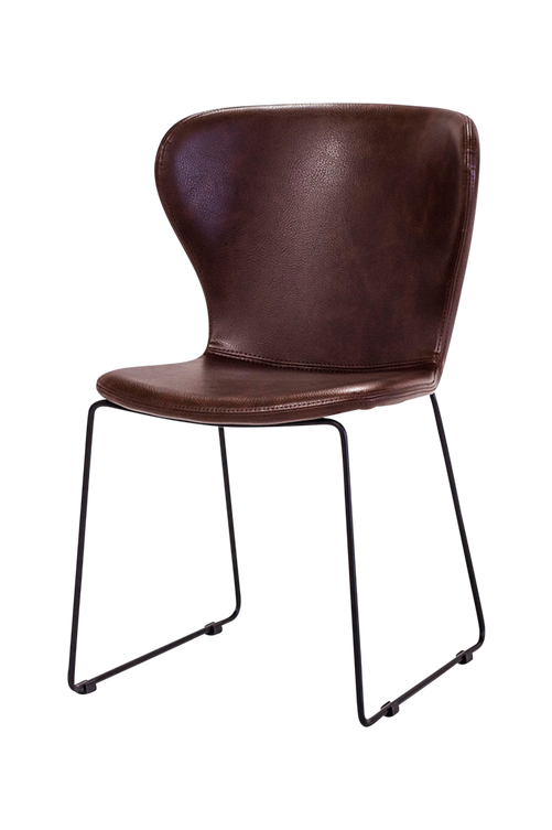 Stol i brun PU med svart metallunderrede. Bredd 52 cm. Djup 63 cm. Höjd 85 cm. Sitthöjd 46 cm. Vikt 7 kg.