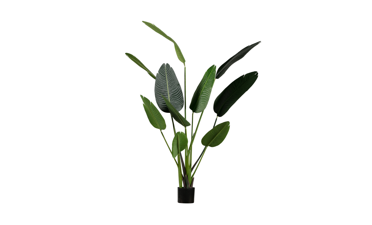 En snygg konstgjord växt som passar perfekt i huset alla rum då den varken kräver solljus eller vatten. Strelitzias blad är tillverkade i grönt tyg med ett väldigt verklighetstroget utseende. Växten kommer med en stilren svart kruka men går bra att lyfta över i vilken kruka som helst. Placera inomhus och med möbeltassar under för att undvika skada på golv.Design & komfortKonstgjord växt i kruka. Tillverkad i 75% tyg, 20% plast och 5% metall.Har måtten: 164x96x63 cm.Tyg & skötselGjord för inomhusbruk. Placera ej i direkt solljus då detta kan orsaka missfärgning. Leverans & förpackningAntal förpackningar: 1 st. Förpackningsmått: 160x30x16 cm.Vikt: 4 kg.