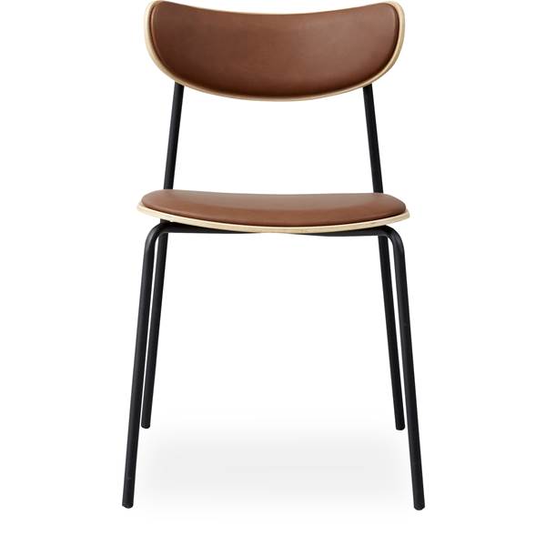 matstol, maxbelastning 120 kg, siddehøjde 48 cm och FSC 100 %. – Sits/rygg i cognacf. konstläder, skal i lackerad ekfanér och stomme i svart pulverlackerad metall