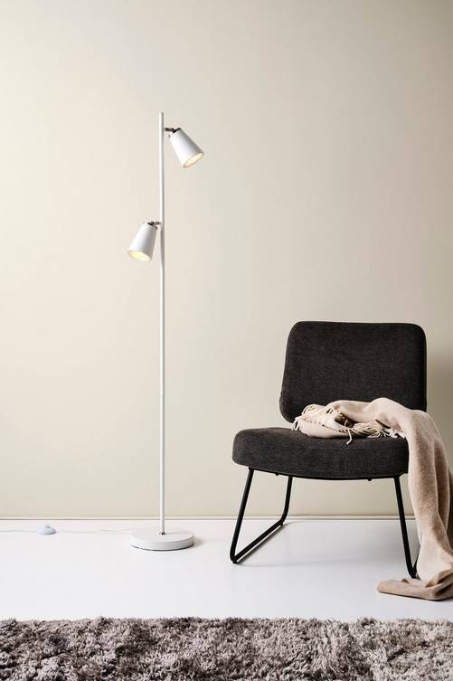 Golvlampa i lackerad metall med kontrasterande detaljer. Svart sladd, sladdlängd 1,7 m. Material: Metall. Storlek: Höjd 153 cm, fot ø 11 cm. Sockel/lampa: 2 st E14, max 25 watt glödlampa. Ljuskälla medföljer ej. Tips/råd: Inred med många ljuskällor. 6-8 st rekommenderas i ett normalstort rum.