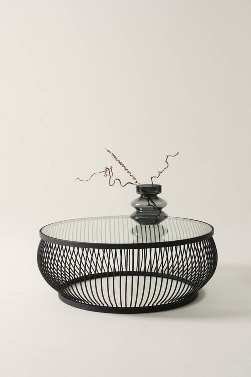 Runt soffbord med karaktär. Bordet har mjuk form som står i kontrast till bordsskivan av glas och underredet som är av metall. Bordsskivan i klarglas gör att ljuset speglas dekorativt och effekten av underredets konstruktion med smala metallsträngar förstärks. Material: Metall och glas. Storlek: Höjd 35 cm, ø 94 cm. Maxvikt: 20 kg. Skötselråd: Torkas av med lätt fuktad trasa och glasputs. Tips/råd: Vackra ljusstakar med levande ljus eller batteridrivna ljus på bordet skapar mysig stämning.