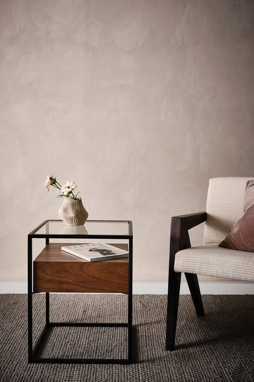 Fyrkantigt sidobord med klarglas som skiva, liten låda av fanerad MDF och metallram. Ett modernt sidobord med dold förvaringslåda och ett utsvarvat handtag i underkant som gör lådan enkel att öppna. Material: MDF, glas och metall. Storlek: Höjd 54 cm, bordsskiva 43×43 cm. Skötselråd: Torkas med fuktig trasa. Tips/råd: Kan du inte få nog av stilen? Vi har även LUDVIKA sidobord och OXBERG soffbord i samma stil.