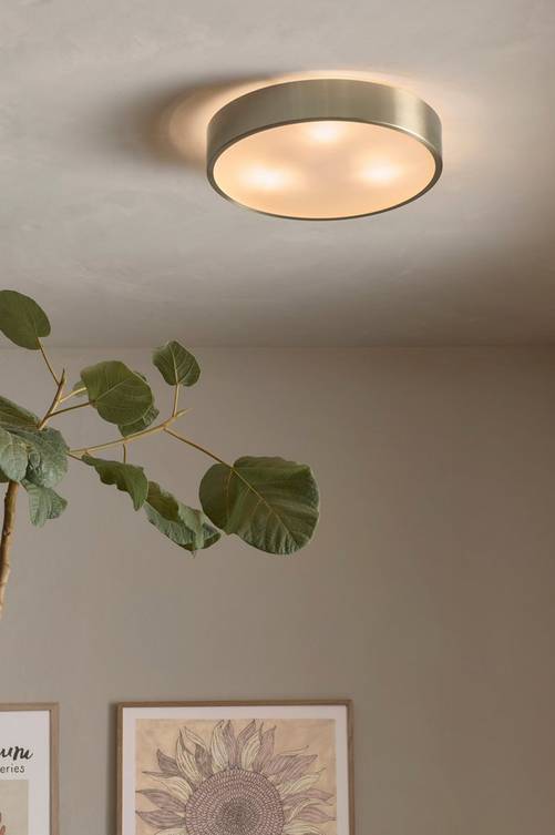 Takplafond av metall med borstad finish och skiva av frostat glas. Ø 40 cm. Höjd 7 cm. Liten sockel, 3xE14. Max 40 W. Ljuskällor ingår ej. Monteras med bygel (medföljer). Jordad Takkontakt ingår ej på grund av nytt EU direktiv. De finns att beställa separat.