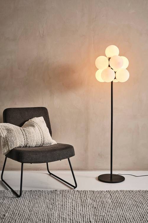 Golvlampa av järn med nio ljuspunkter i frostat glas. TED är en stilren golvlampa i en modern och avskalad design. Svart sladd, sladdlängd 1,8m. Material: Järn och glas. Storlek: Total höjd 148 cm. Skärm: ø 40 cm. Sockel/lampa: 9 st G9 max 5 w glödlampa. Ljuskälla medföljer ej. Tips/råd: Inred med många ljuskällor. 6-8 st rekommenderas i ett normalstort rum.