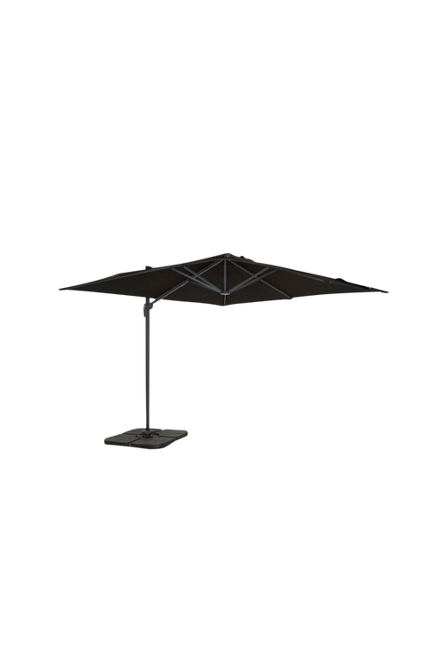 Hängparasoll med pulverlackerad aluminiumstolpe och aluminiumribbor. Med luftventil och vev för att öppna och stänga paraplyet. Med 360 graders justerbarhet. Tillverkad med en svartfärgad 240 g polyester och med PA-beläggning. Paraplyet levereras med en X-fot men inte med plattor. Mått 300×300 H245