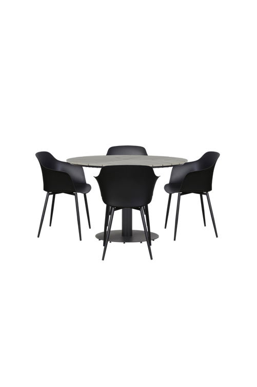 Trädgårdsbordets yta är gjord av polywood, vilket är ett fantastiskt material med samma struktur som äkta trä, och som är tillverkat av återvunna material. Bordsskivan har askgrå färg. Bordet har bara ett ben, med bred fot, och har många justeringsmöjligheter. Den svarta stommen är tillverkad av aluminium och underhållsfri metall. Den populära skalstolen finns i flera olika färger och passar i såväl konferensrummet som på terrassen. Skalstolarna är tillverkade i nordisk stil, men har moderna detaljer som armstöd och snygga färger. Armstödet är en del av själva skalet och metallbenen har en rostskyddande beläggning, så att du kan använda stolarna både inomhus och utomhus. Modellen har den traditionella svarta färgen.