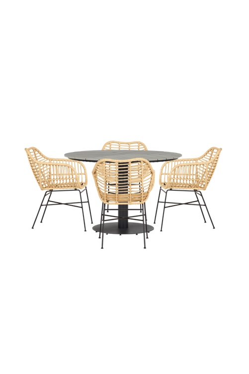 Bordsskivan är gjord av polywood, vilket är ett fantastiskt material med samma struktur som äkta trä, och som är tillverkat av återvunna material. Bordsskivan har askgrå färg. Bordet har bara ett ben, med bred fot, och har många justeringsmöjligheter. Den svarta stommen är tillverkad av aluminium och underhållsfri metall. Trädgårdsstol av polyrotting, som är väldigt bekväm att sitta i. Stolen är underhållsfri och benen av robust men tunn metall och sitsens vackra, handvävda polyrotting förstärker den enkla designen. Vi rekommenderar att du vinterförvarar möbeln under ett skydd eller inomhus. Polyrotting är ett perfekt material för trädgårdsmöbler eftersom det är både mjukt och slitstarkt. Det är resistent mot mögel och fukt, samtidigt som det är mycket snyggt.