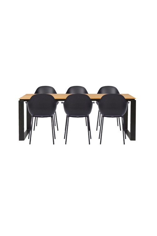 Smakfullt trädgårdsbord med modern design och snygg finish. Benen är tillverkade av aluminium och består av två kvadratiska ramar i vardera bordsände. Det ger ett modernt intryck och gör att bordet är mycket stabilt. Bordsskivan är tillverkad av polywood – ett mycket trevlig material som ser ut som trä och är enkelt att rengöra. Bordet är underhållsfritt. Stolen är tillverkad av återvunnen plast från haven. Den här vackra och bekväma skalstolen är tillverkad av 74 % återvunnen plast som kommer från haven. Den har armstöd och ett högt ryggstöd som gör att den är extra bekväm att sitta i. Det är en mycket elegant design med genomtänkta detaljer, t.ex. de stilfulla benen. Stolen är bred, så att du sitter bekvämt. Den fungerar som de flesta andra stolar, men känns exceptionellt stabil och hållbar. Benen är tillverkade av kraftig metall. Stolen är underhållsfri och kan användas både utomhus och inomhus.