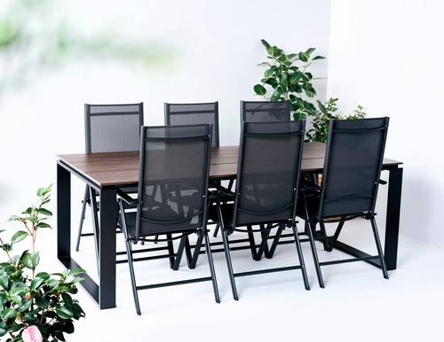 Smakfullt trädgårdsbord med modern design och snygg finish. Benen är tillverkade av aluminium och består av två kvadratiska ramar i vardera bordsände. Det ger ett modernt intryck och gör att bordet är mycket stabilt. Bordsskivan är tillverkad av polywood – ett mycket trevlig material som ser ut som trä och är enkelt att rengöra. Materialet är utformat för att se ut som brädor av douglasgran med en fin brun färg. Bordet är underhållsfritt. Trädgårdsstol med svart stomme av aluminium och svart sits av kraftigt meshmaterial. Meshmaterialet är bekvämt att sitta på och ingen stolsdyna behövs. Stolen är enkel att fälla ihop och passar perfekt för gäster. Den har även en steglös funktion som gör att du nästan kan ligga raklång. Armstöden är breda och solida. Den långa och ovala stommen är robust och stabil. Stolen är underhållsfri.