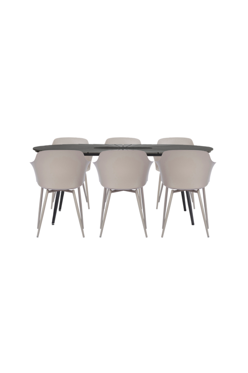Fint, stort trädgårdsbord med stomme av aluminium med galvaniserad yta. Plattorna är gjorda av stilfull polywood med samma struktur som trä, samtidigt som de är underhållsfria, precis som resten av bordet. Delen i mitten är täckt med Spraystone™ och är en fin detalj. Materialet av Spraystone™ har en mycket djup färg. Mörk färg i mitten och polywood i färgen Cappuccino Ek. Den populära skalstolen finns i flera olika färger och passar i såväl konferensrummet som på terrassen. Skalstolarna är tillverkade i nordisk stil, men har moderna detaljer som armstöd och snygga färger. Armstödet är en del av själva skalet och metallbenen har en rostskyddande beläggning, så att du kan använda stolarna både inomhus och utomhus. Modellen har en modern flintgrå färg.