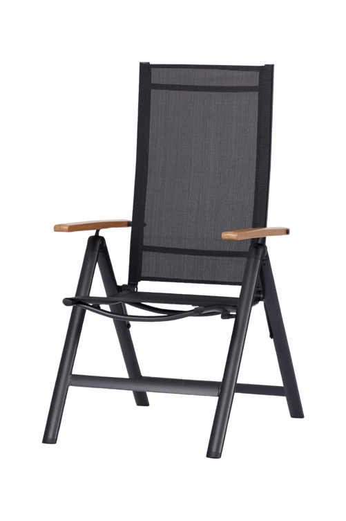 Trädgårdsstol med svart stomme av aluminium och svart sits av kraftigt meshmaterial med olefin. Meshmaterialet är bekvämt att sitta på och ingen stolsdyna behövs. Stolen kan enkelt fällas ihop och tas fram när du får gäster. Den har även en steglös funktion som gör att du nästan kan ligga raklång. Armstöden med teakfärgad folie är breda och stabila att hålla i. Stolen har en lång och oval stomme och känns robust och stadig. Mått: B57 x D68 x H110 cm.