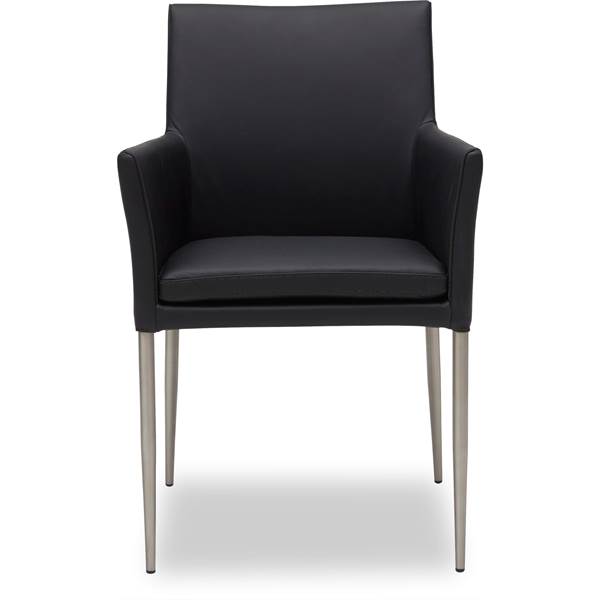 matstol, med armstöd, ej stapelbar, maxbelastning 110 kg och siddehøjde 50 cm. – Svart läder och ben i borstat stål