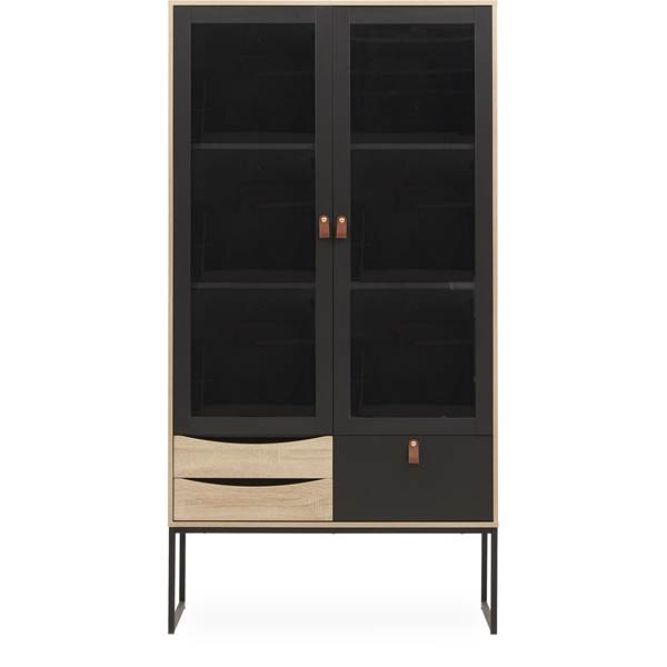 Vitrinskåp, 2 luckor, 3 lådor, Produkten levereras med svart och brunt läderhandtag och FSC Mix 70 %. – Stomme i spånplatta med svart folie, Framsidor i svart- och ekstruktur folie och stomme i svartmålad metall