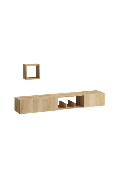 100% SPÅNSKIVA MED MELAMINBELÄGGNING Vägghylla, mått: Bredd: 25 cm Höjd: 25 cm Djup: 15 cm Tv-bänk, mått: Bredd: 180 cm Höjd: 25 cm Djup: 32 cm Lådans bredd: 50 cm Antibakteriell Montering krävs
