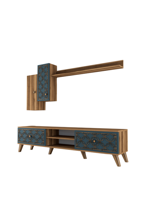 100% SPÅNSKIVA MED MELAMINBELÄGGNING Tjocklek: 1,8 cm 4 mm CNC Relief Ben av plast Tv-bänk, mått: Bredd: 180 cm Höjd: 44 cm Djup: 35 cm Vägghylla, mått: Bredd: 120 cm Höjd: 11,8 cm Djup: 16,1 cm Skåpets mått: Bredd: 26,5 cm Höjd: 63 cm Djup: 21,8 cm (2 st.) Flera hyllplan Kan fästas i väggen
