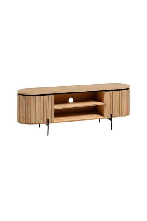 Licia tv-bänk är tillverkad av mangoträ, med delar som placerats en i taget, vilket skapar dess form. Den är också lackerat för att ge alla delar en fin lyster, slipad och formad för hand. Metallbenen och detaljer är målade i svart, matt färg och är väl synliga, vilket följer trenden med öppna strukturer och har plats för att öppna dörrar utan att behöva ha handtag. Bredd: 160 cm. Djup: 43 cm. Höjd: 56 cm.