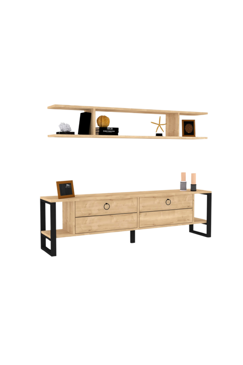 100% SPÅNSKIVA MED MELAMINBELÄGGNING Tjocklek: 3 cm Stomme: 100% METALL Tv-bänk, mått: Bredd: 160 cm Höjd: 45 cm Djup: 30 cm Vägghylla, mått: Bredd: 150 cm Höjd: 25 cm Djup: 20 cm