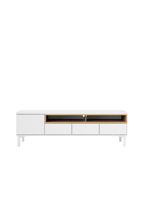 Denna tv-bänk, med modern och strömlinjeformad design, är det perfekta tillskottet i vardagsrummet och passar enkelt in med befintliga möbler i hemmet. Den breda möbeln har perfekt utrymme för en stor tv. Undertill finns två öppna utrymmen med plats för dekorationsföremål eller din spelkonsol. De tre lådorna håller allt annat organiserat: laddare, kablar och spel.