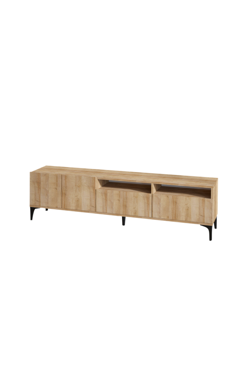 100% SPÅNSKIVA MED MELAMINBELÄGGNING Tjocklek: 1,8 cm Bredd: 180 cm Höjd: 52 cm Djup: 35 cm Ben av plast Flera hyllplan Kan fästas i väggen