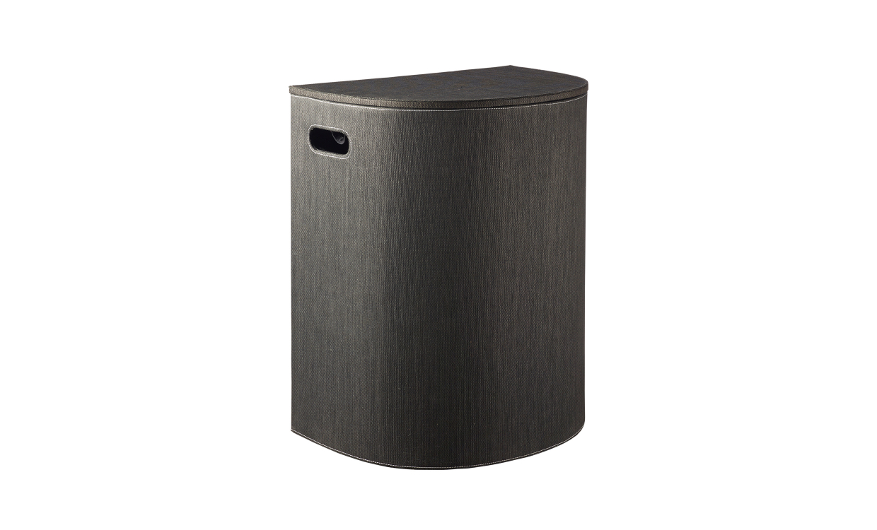 Denna korg är tillverkad av återvunnet papper och kartong vilket gör den mjuk men stark och hållbar. Korgen är platt längs ena långsidan för att smidigt passa mot väggen, medan andra sidan är rundad. Korgen har ett praktiskt lock och två handtag så den lätt kan flyttas runt.Design & egenskaperPraktisk korg som kan förvara tvätt, leksaker eller filtar.Tillverkad i återvunnet papper och kartong.Har en behaglig svart färg.Leverans & förpackningLevereras monterad. Antal förpackningar: 1 stFörpackningsmått: 71x51x61 cmVikt: 11,5 kg