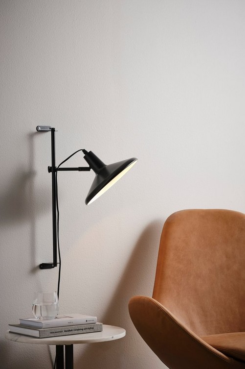 Enfärgad vägglampa i metall med en lampskärm som är vridbar runt fästet och höj- och sänkbar. Blank, vit insida på lampskärmen reflekterar ljuset. Sladdlängd 1,5 m. Material: Metall. Storlek: Fästets höjd 50 cm, skärm ø 25 cm. Sockel/lampa: 1 st E27, max 40 w glödlampa eller max 7 w lågenergilampa. Ljuskälla medföljer ej.